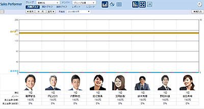 株価チャートのように3ヵ月移動平均、6ヶ月移動平均トレンド、積上げ推移、前年同月比グラフのほか、曜日比率、前半中盤後半比率や、目標達成必要日数や当月、当期の着地予測(実績予測)を表示して、個人やグループ、全社の傾向を見ることが可能になりました。