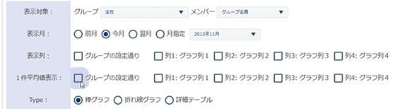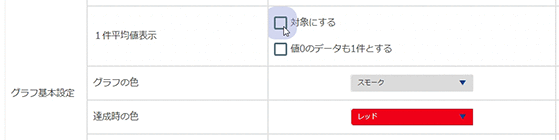 1. [グラフ設定] – [グラフ基本設定] – [1件平均値表示]欄にて、1件平均値を表示させたいグラフ列をチェック