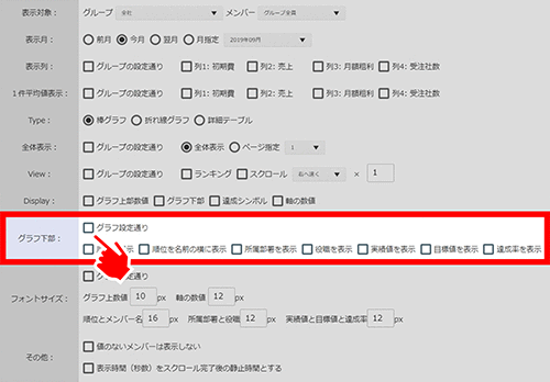 [ディスプレイモード設定]-[ステップ:各種グラフ]で、[グラフ下部]-[グラフ設定通り]にチェックを入れると、[グラフ設定]-[グラフ下部表示]-[グラフ列ごとの実績、目標、達成率の表示/非表示]で設定した内容が反映され、必要な箇所のみが表示されるようになりました。