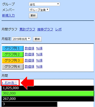 1,修正したい月の「月間グラフ」を表示させ、該当メンバーを選択します