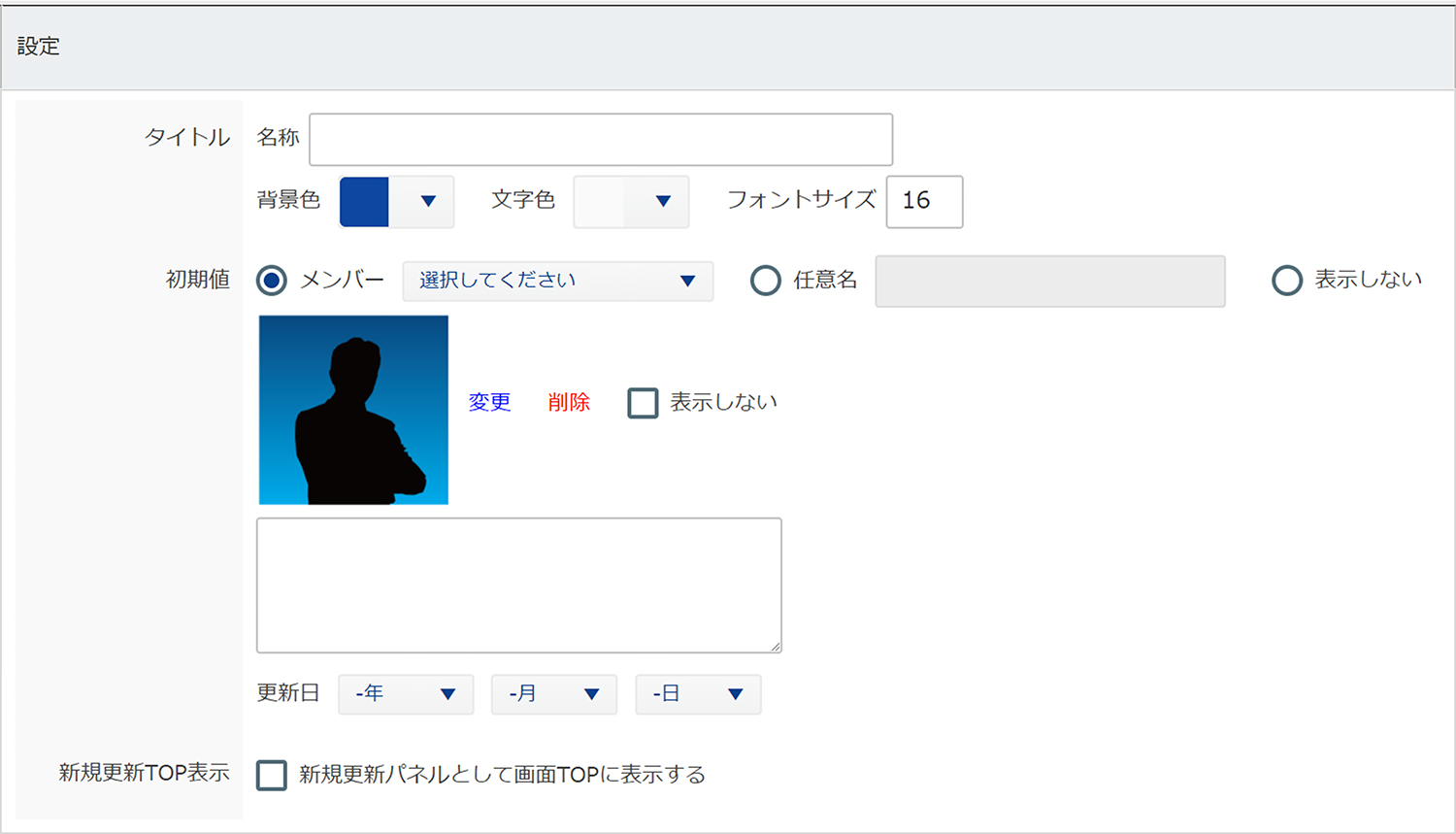 | フリーパネル | 項目「アワード」と同じ機能ですが、「新人紹介」「今月の目標コミット」など、「アワード」と区分けしてご利用ください(自動更新不可) | 送信不可 |