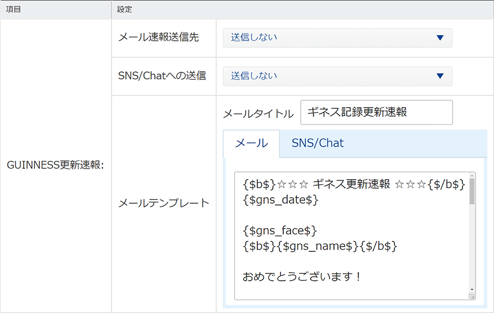 「メール設定-GUINNESS更新速報」から速報メール本文の設定が可能です。