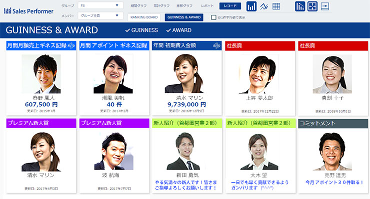 「社長賞」や「新人賞」など、数値の記録更新でなく、表彰者を表示し、承認感、満足感を高めるもの