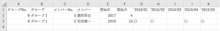 グループ所属から外れた年月が発生した場合、下記の例に沿って書き出されます
