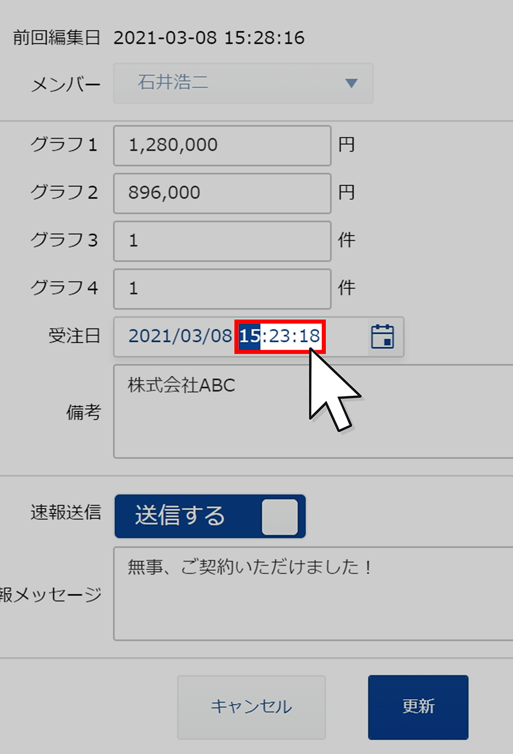 | 1,CSVインポート実行時の時刻が、「受注日 -*時*分*秒 」へ自動的に反映されてしまう 2,スマホ版で詳細テーブルの編集を行うと、実施時刻が「受注日 -*時*分*秒 」へ反映されてしまう |