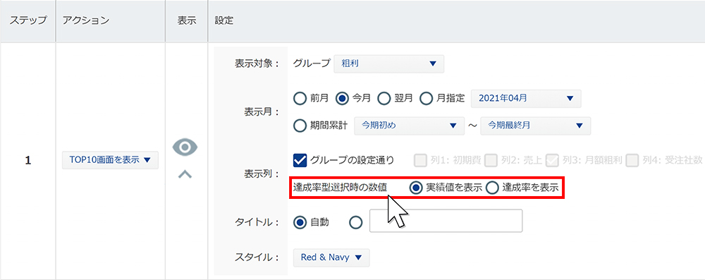 これまでは、「達成率型グラフ」を[ディスプレイモード:TOP10]で表示させると「達成率(%)」でしか表示できませんでしたが、状況に合わせて「実績、達成率」が選択できるようになりました。