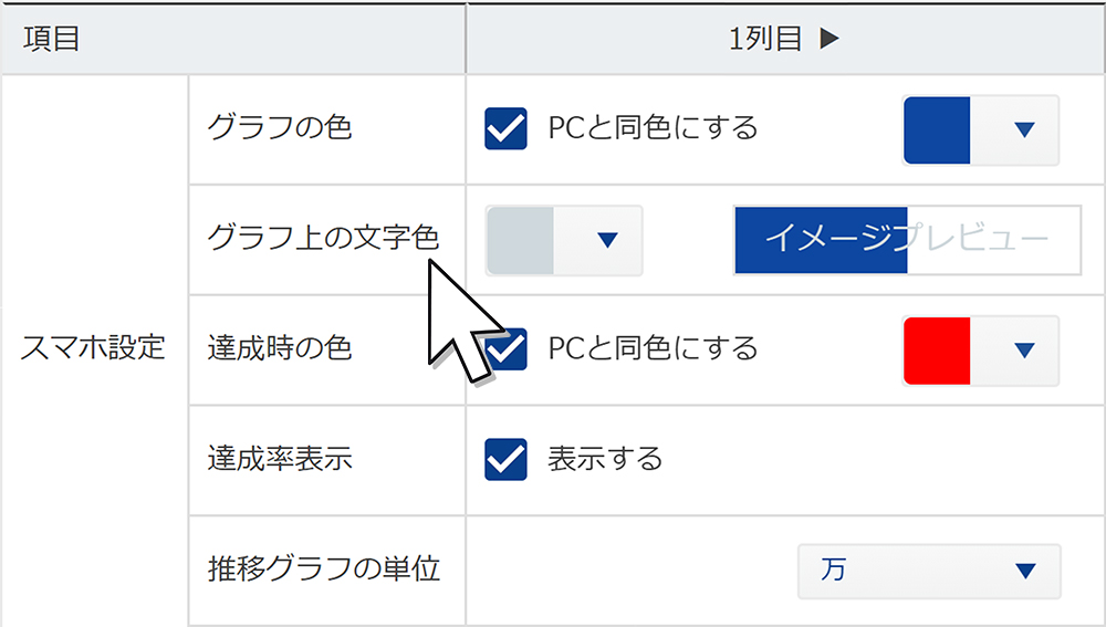 グラフ列ごとに表示/非表示を設定でき、目標グラフの色も選択できます。