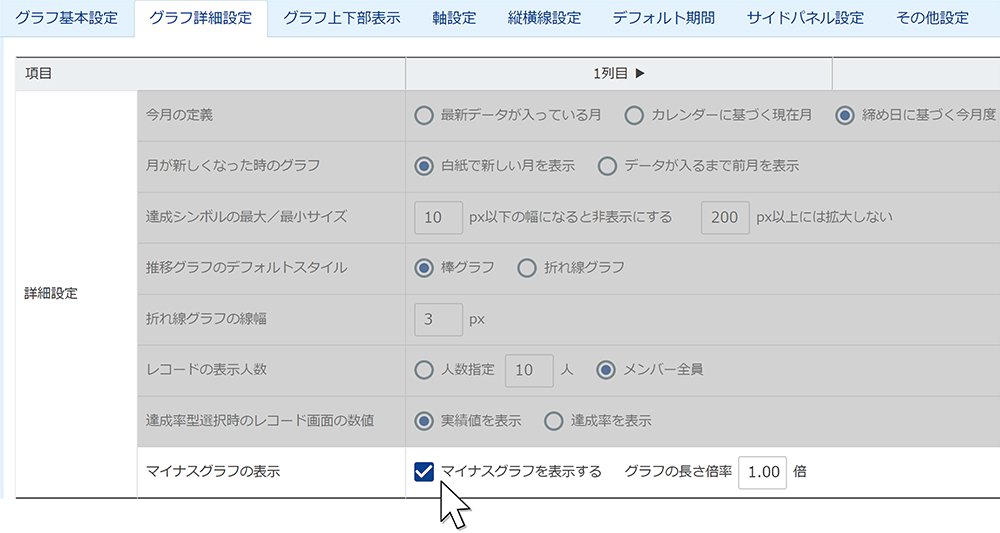 「グラフ設定-グラフ詳細設定-マイナスグラフの表示」から、[マイナスグラフを表示する]チェックで表示ON/OFFが設定できます。