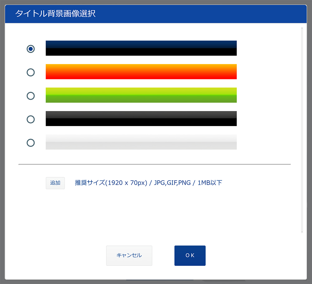 | タイトル背景 | 背景色/背景画像 | タイトル表記の背景表示で「色(5パターン)」「画像」が指定できます また、オリジナル画像も追加可能です ※ 推奨:1,920px × 70px ※ ファイルサイズは1MB以内での調整が必要です ![]() |