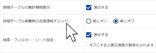 詳細テーブル編集時の「速報送信チェックの初期値」で[常にON/OFF」が設定可能に